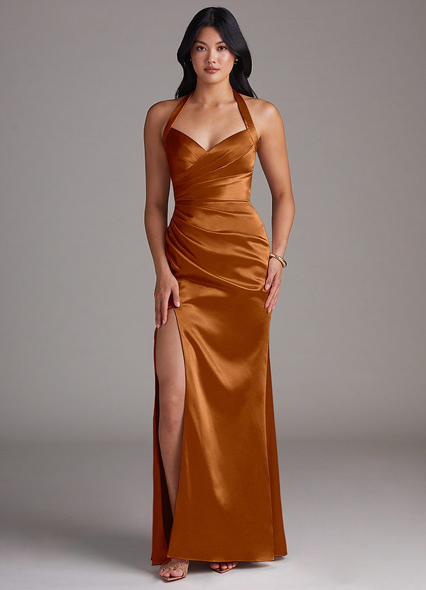 Azazie Emeria Sheath Side Slit Metallic Satin Dress