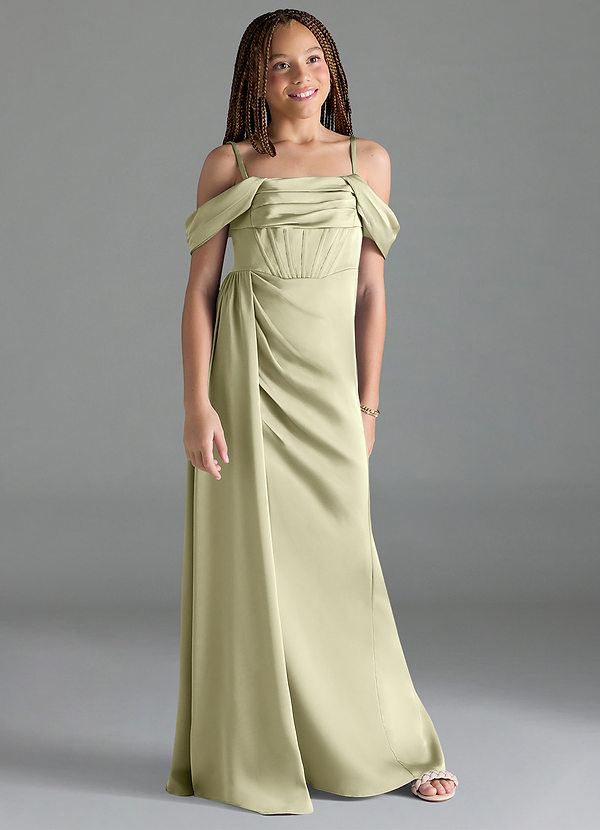 Azazie Amyra Junior Sheath Off the Shoulder Stretch Satin Dress