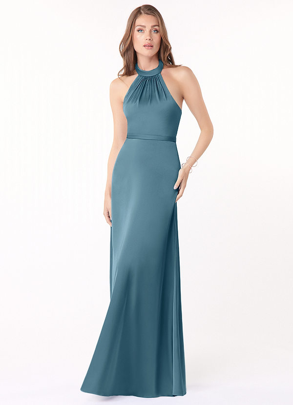 Azazie Delmar A-Line Halter Bow Stretch Satin Dress