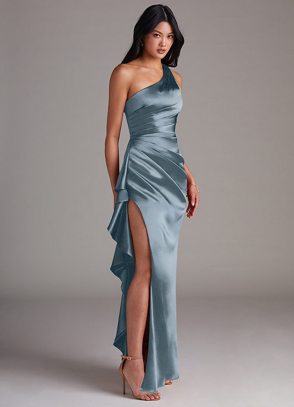 Azazie Latrice Sheath One Shoulder Metallic Satin Dress