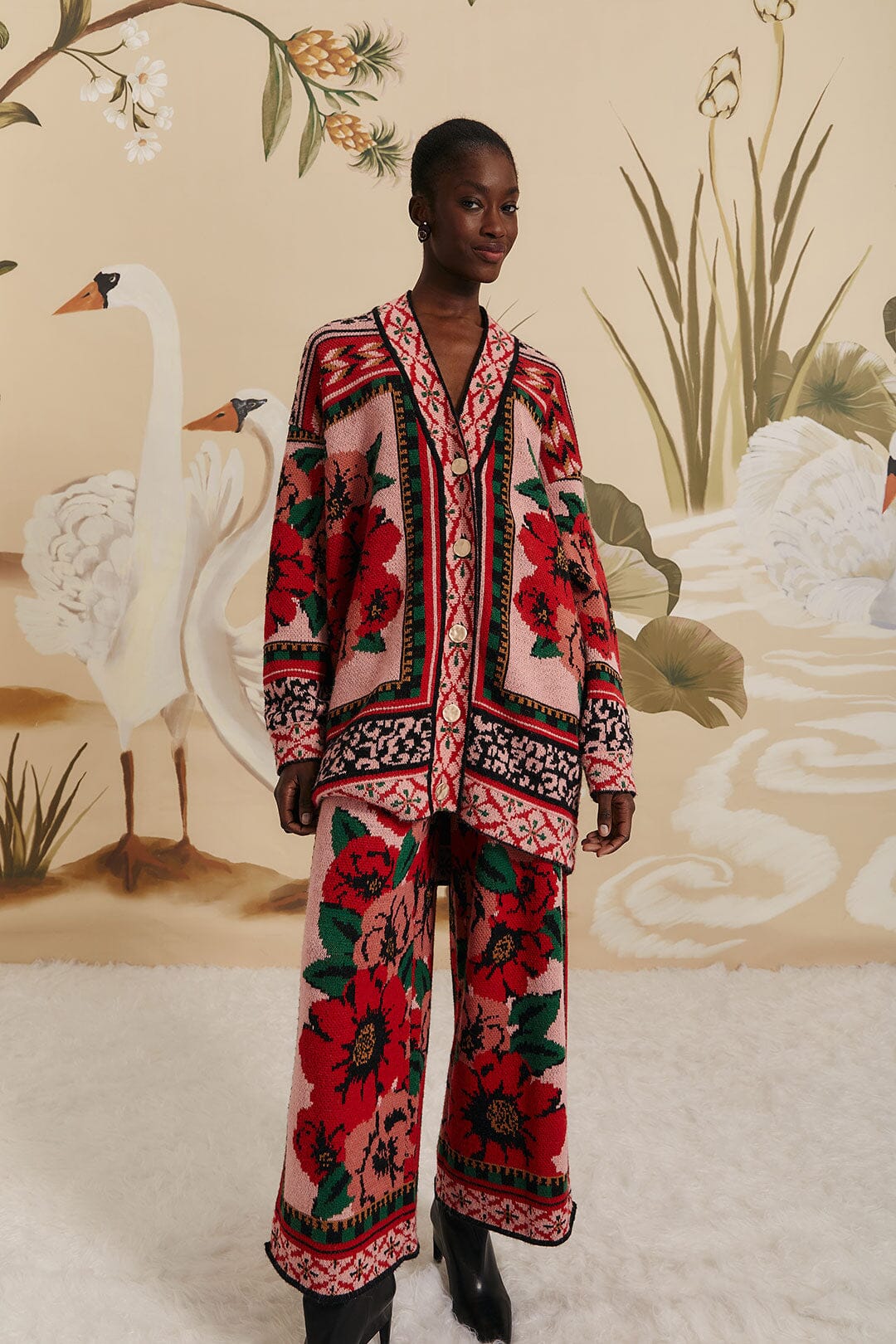 Farm Rio pink flower tapestry knit pants