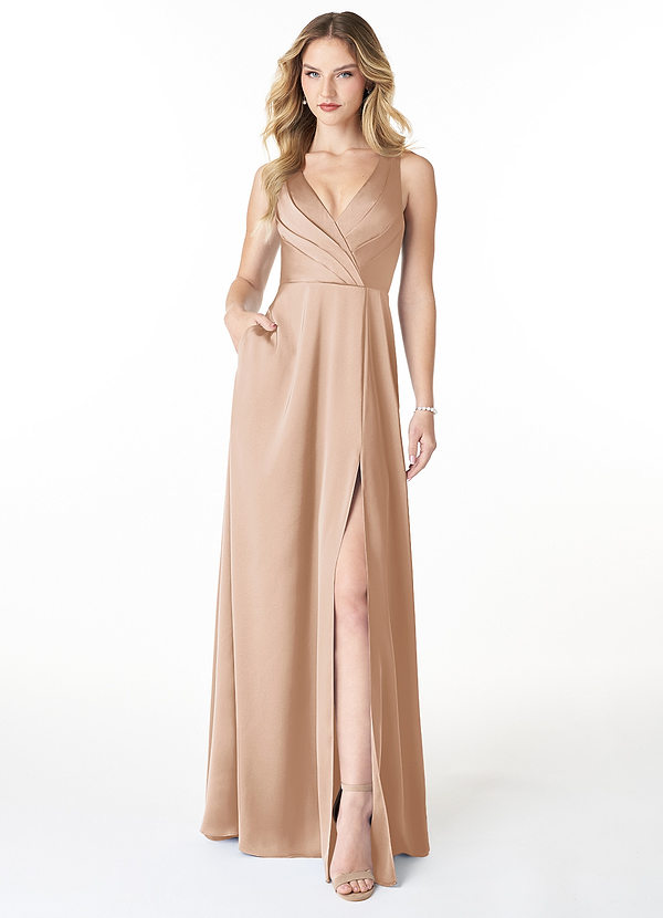 Azazie Nelly A-Line V-Neck Pleated Stretch Satin Dress