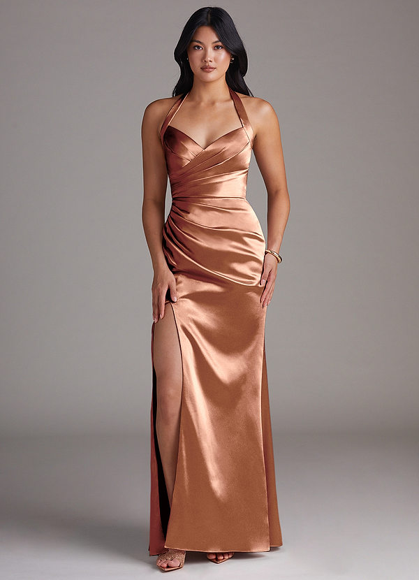 Azazie Emeria Sheath Side Slit Metallic Satin Dress