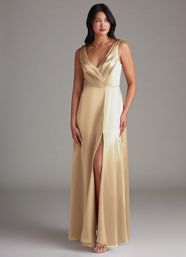 Azazie Nelly A-Line Pleated Metallic Satin Dress